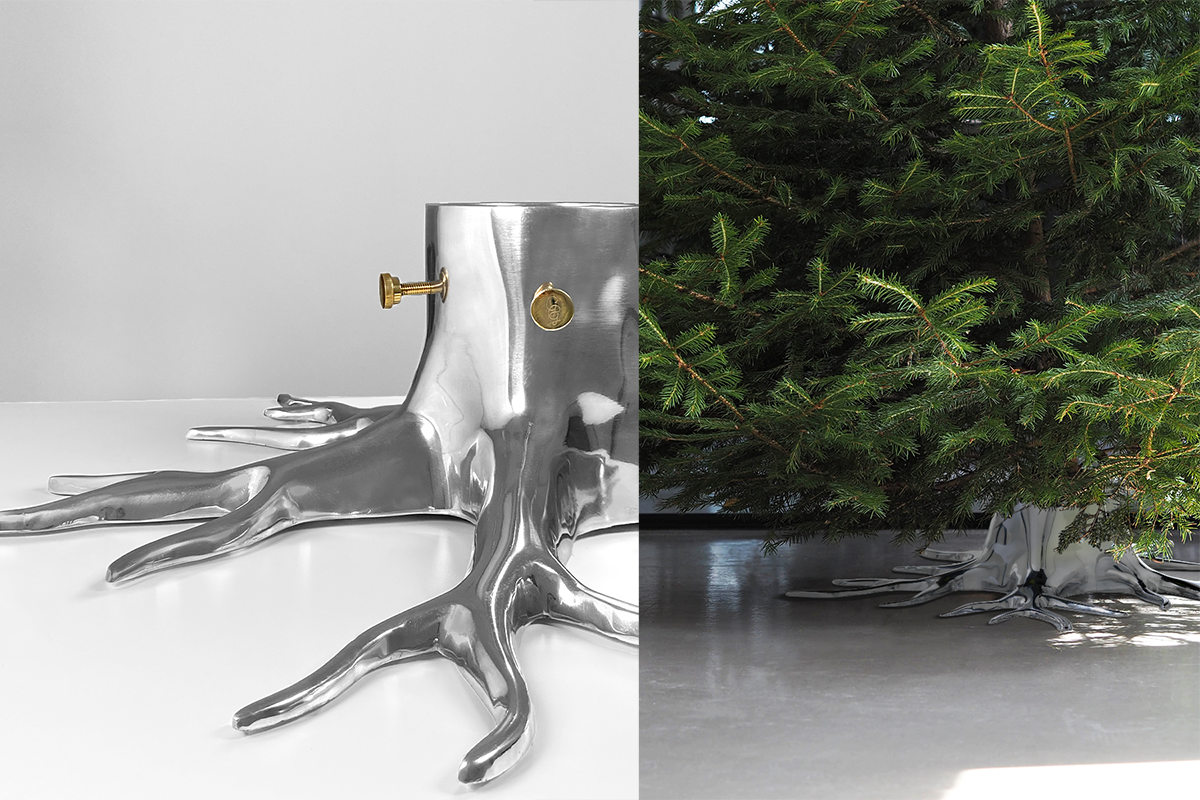 The Root är en stilig julgransfot i gjuten aluminium som ger granen tillbaka sina rötter. Välj mellan silver eller svart.